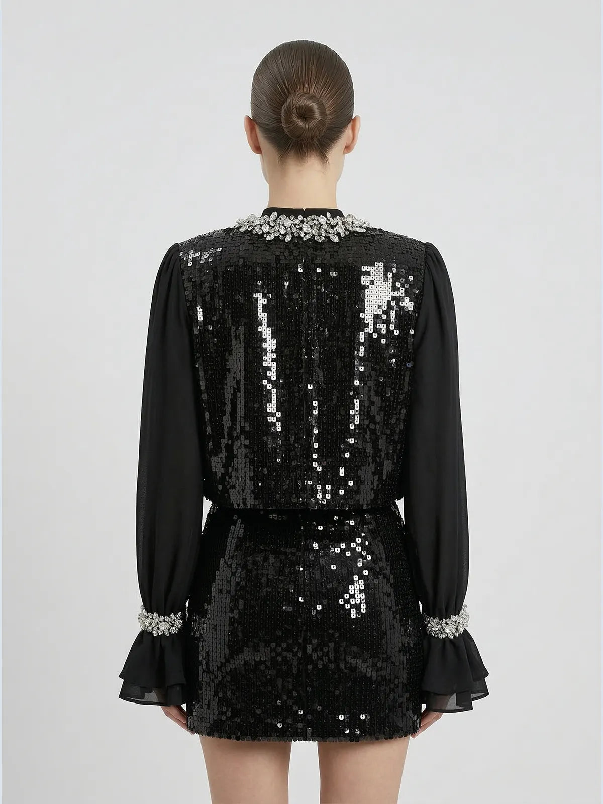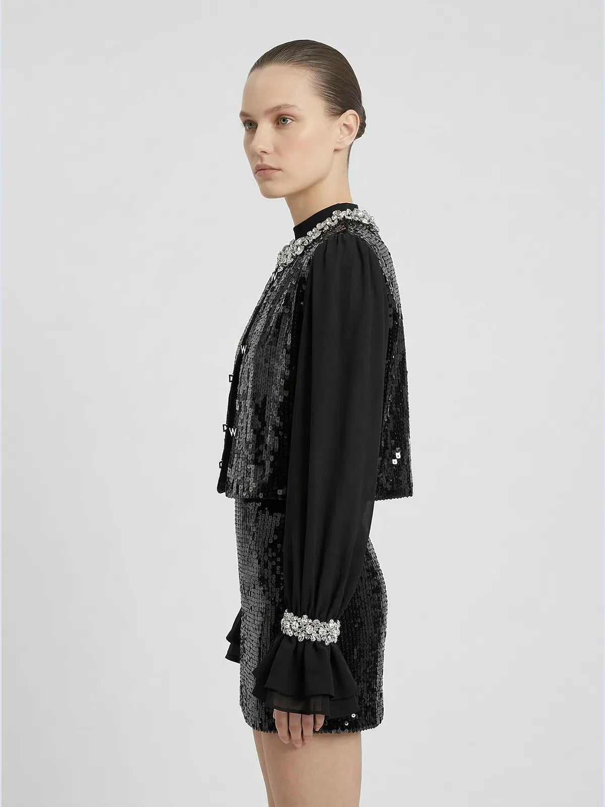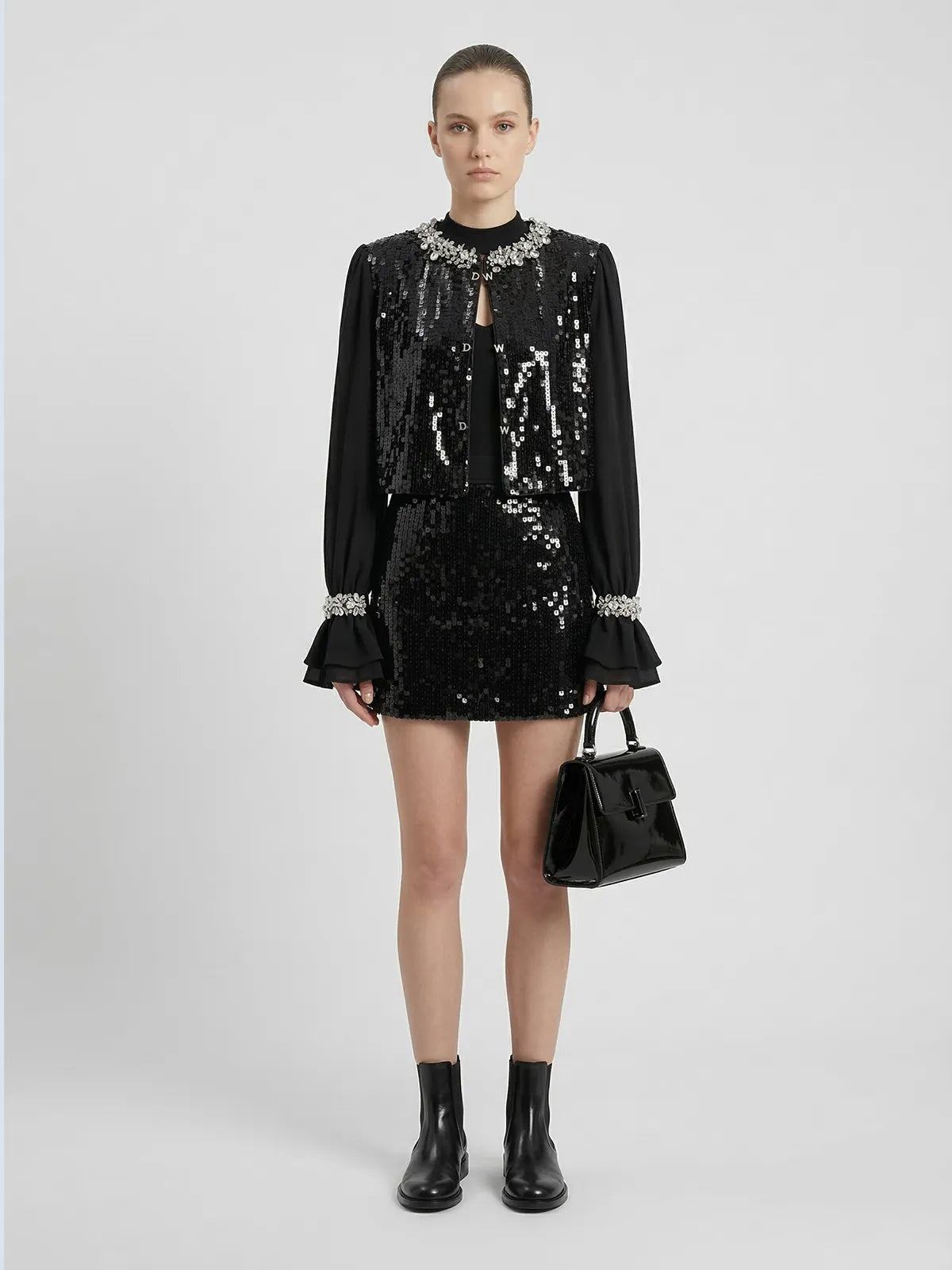 This statement jacket captures the essence of nocturnal glamour, featuring a fluid interplay between shimmering sequins and high-contrast crystal embellishments. It is a silhouette designed for the modern woman who seeks to balance high-fashion drama with meticulous craftsmanship.
