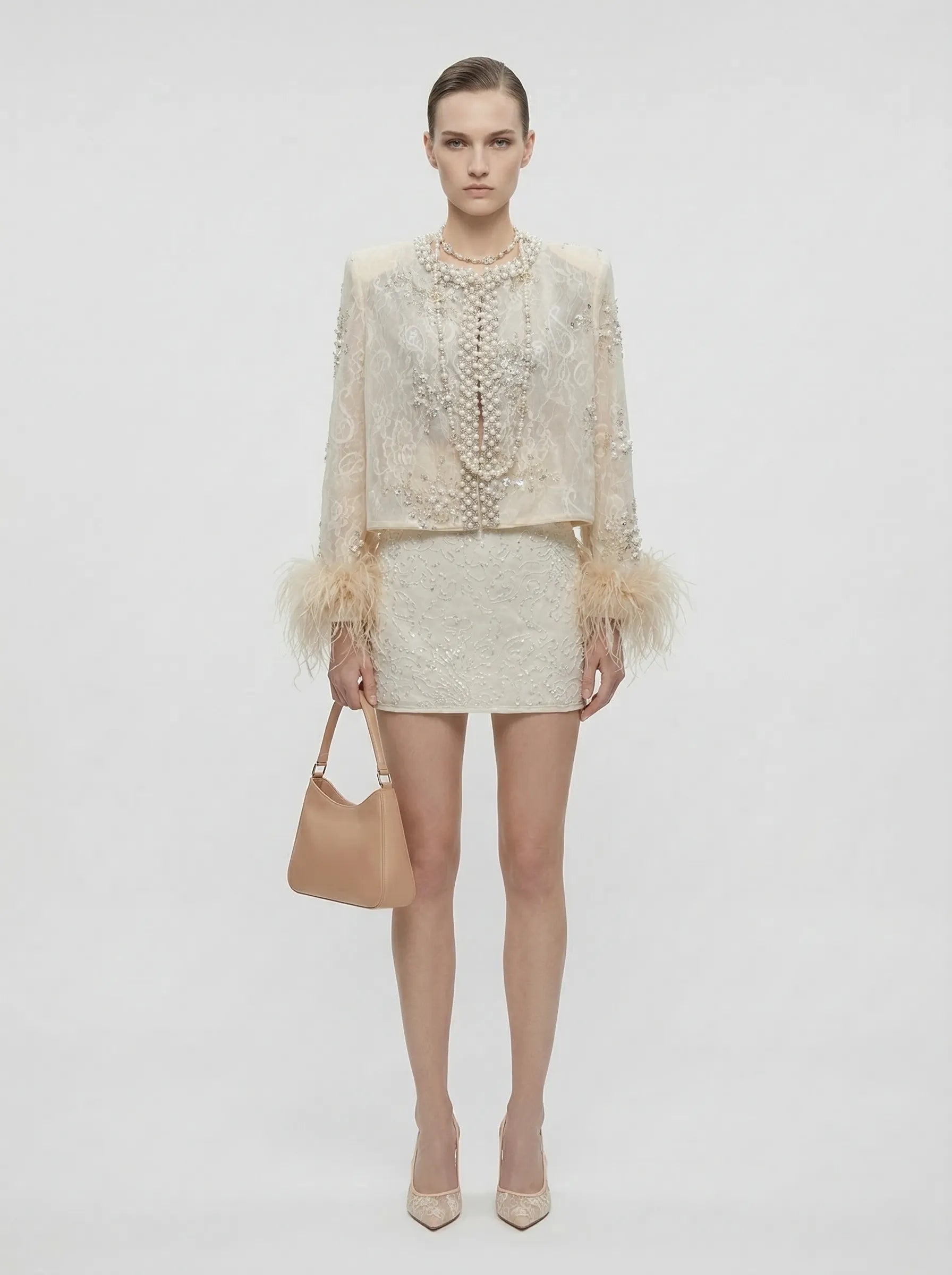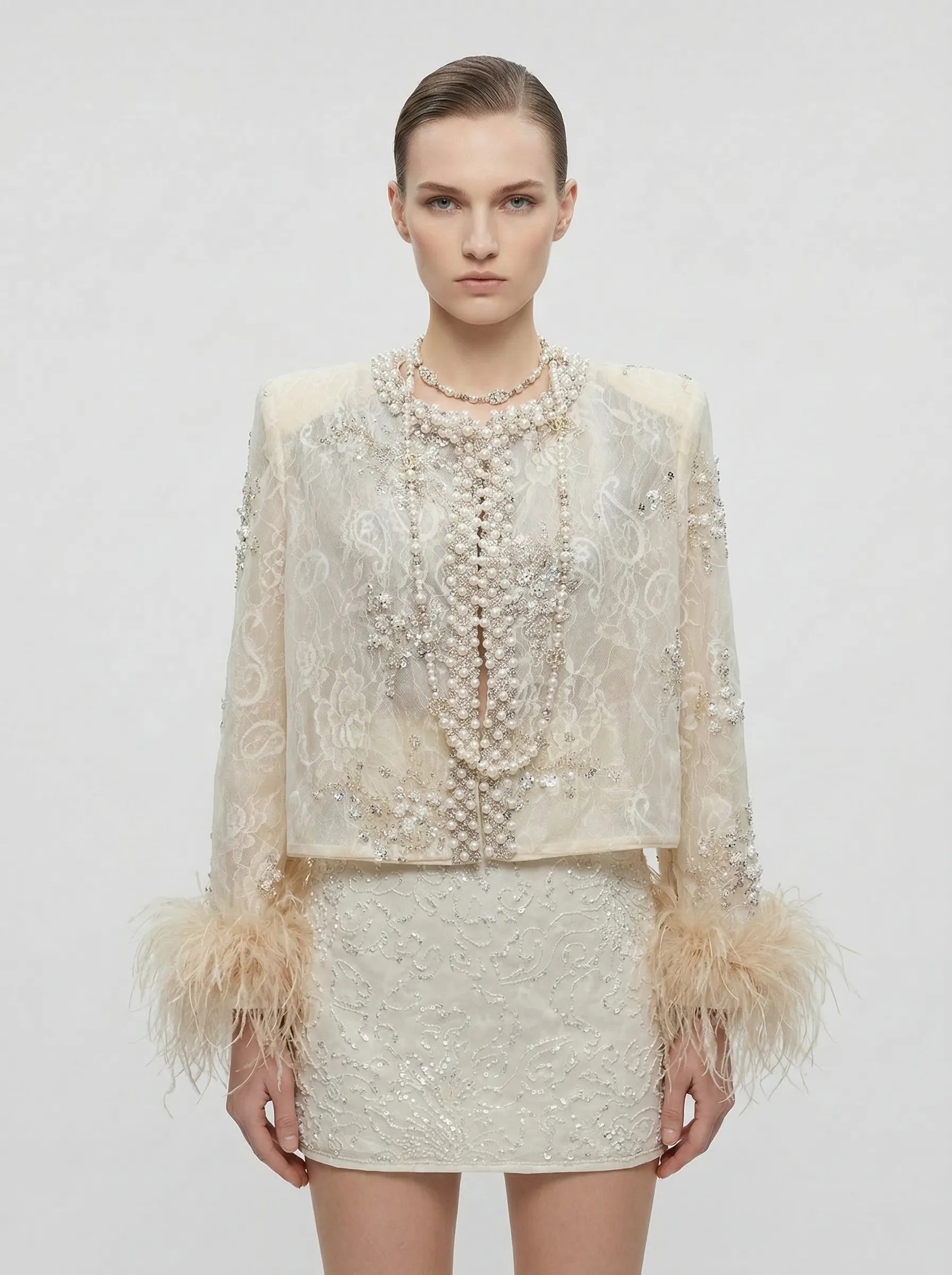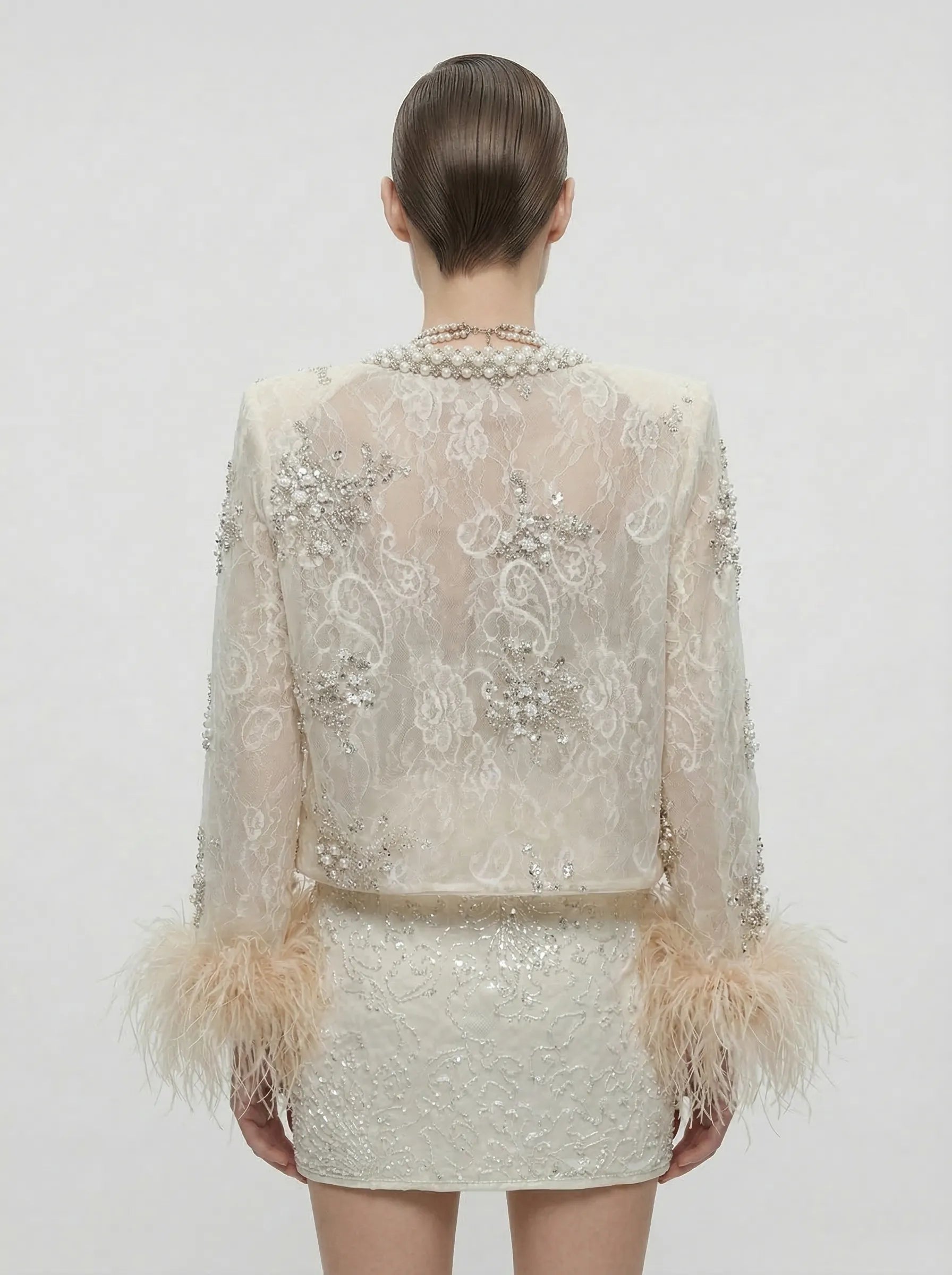 This exquisite ensemble captures the essence of dreamlike opulence. Featuring intricate floral lace overlaid with hand-sewn pearls and crystals, the set is finished with dramatic feather cuffs that add a sense of fluid, ethereal movement to every gesture.