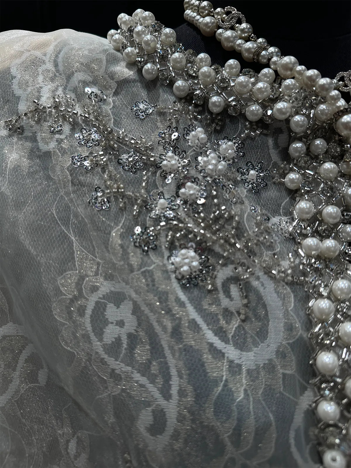 A masterpiece of ethereal luxury, blending delicate organza lace with decadent pearl artistry.